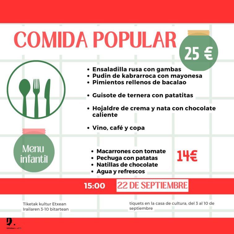 Este año, por primera vez, el Ayuntamiento de Urretxu ha organizado una comida popular en el día de la Euskal Jaia. Los primeros 500 tickets puestos a la venta se agotaron rápidamente y ha organizado una segunda convocatoria.